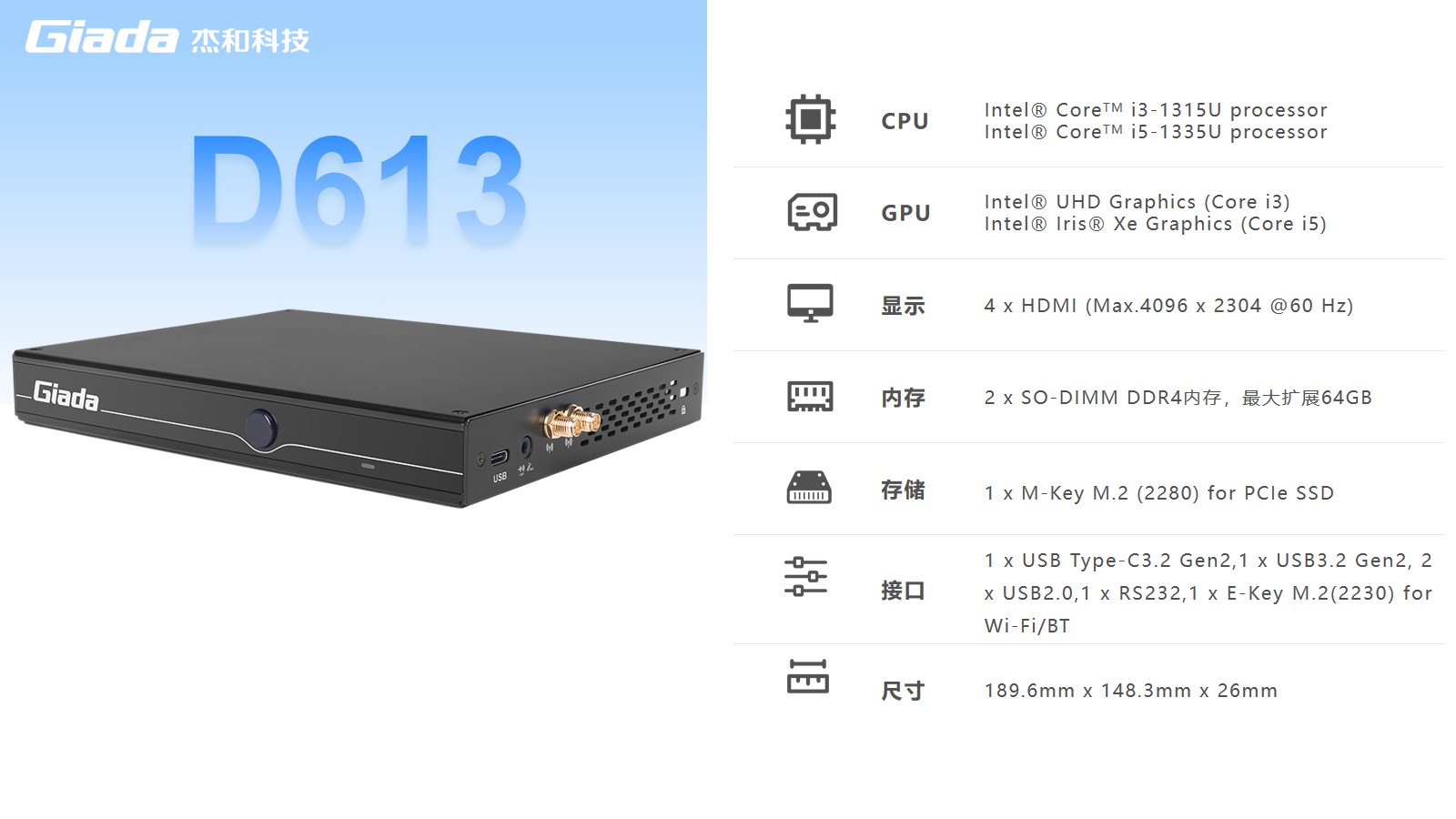 k8·凯发(国际)数字标牌D613搭载Intel RaptorLake Corei3-1315U/i5-1335U处理器,可以同时连接4个4K显示器,支持4K分辨率编码解码,还支持5G蜂窝网络,速度比4G LTE快10倍。