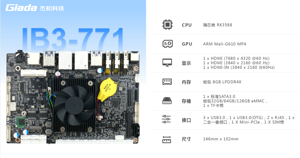 k8·凯发(国际)主板IB3-771搭载瑞芯微RK3588八核64位处理器,内置6TOPS算力的NPU,具备高算力、内存大、超强多媒体、多重扩展等技术优势。满足8k超高清视频的显示需求,还支持主流深度学习框架,为各类 AIOT 应用场景提供更优的性能表现,支持机器人、边缘计算、智能NVR、智能汽车、智慧大屏、AR/VR、智能自助终端场景的广泛应用。